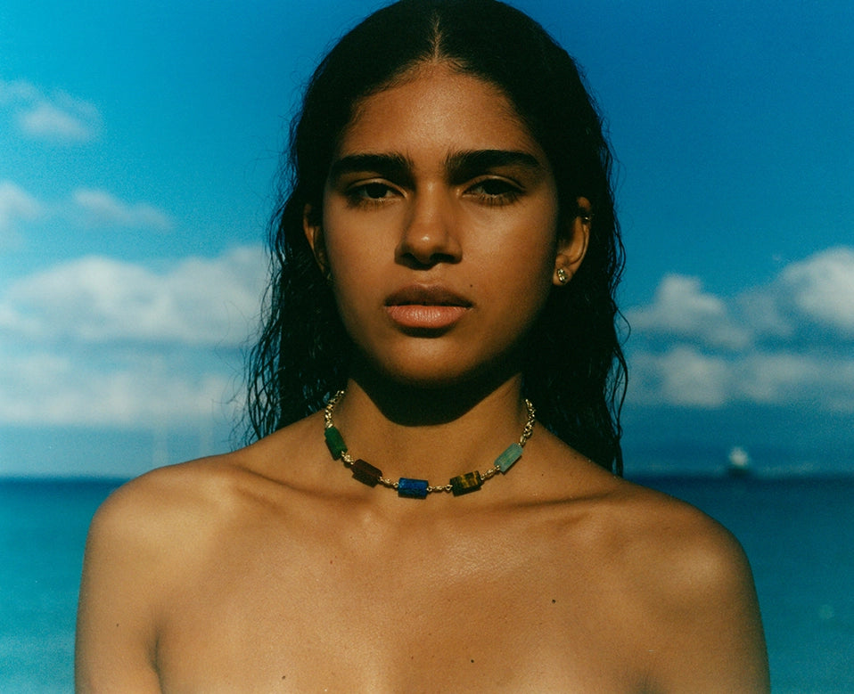 Shades of the collection mirror the stoic beauty of semi-precious stones. From the fiery energy of carnelian, the glowing warmth of yellow aventurine, the delicate blush of rhodonite and the tranquil blue of aquamarine.
